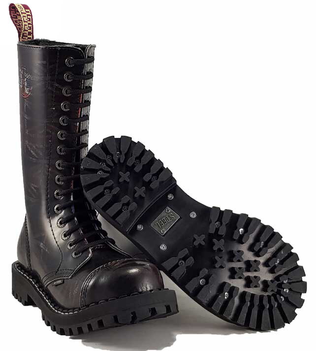 Steel Stiefel 15 Loch, Obermaterial Leder, Sohle aus gehärtetem Gummi, Dreifachnaht, Stahlkappe, Einlegesohle aus Fleece. Die Schuhe sind 31 cm hoch, die Sohle misst unter der Ferse 3,72 cm, die Sohle unter der Spitze 2,41 cm